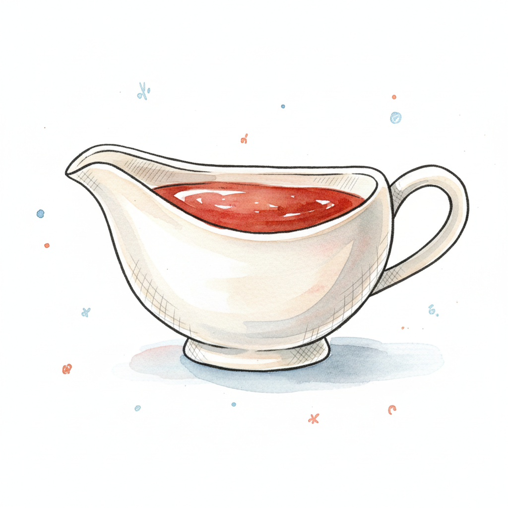 Aquarell-Illustration einer weißen Sauciere gefüllt mit roter Soße auf weißem Hintergrund.