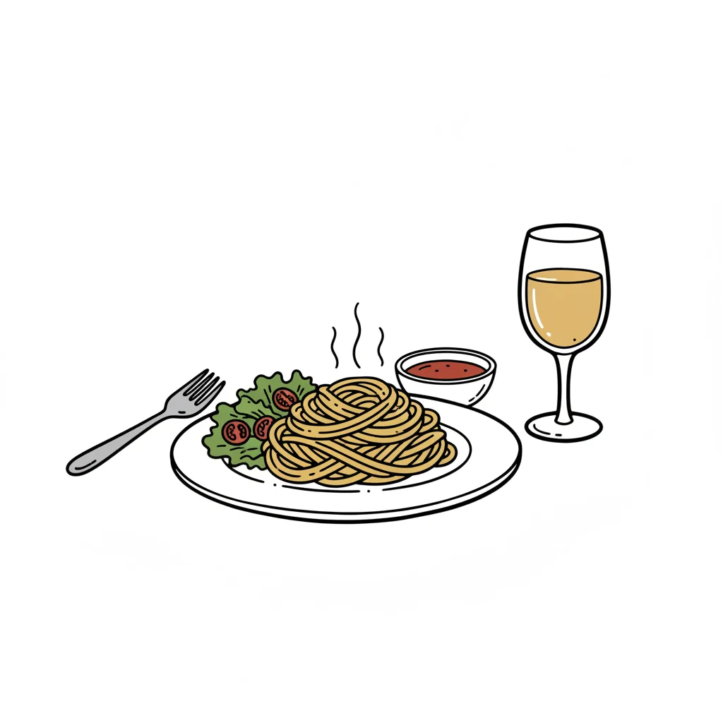 Illustration: Heiße Spaghetti mit Beilagensalat, Soße, Gabel und Weißwein auf weißem Hintergrund.
