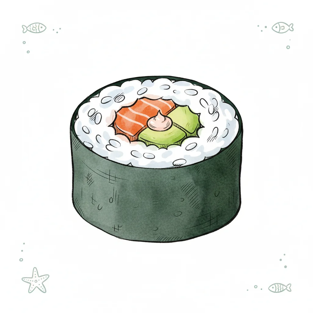 Handgezeichnete Illustration eines Sushi-Makis mit Lachs, Avocado und Soße auf weißem Grund.