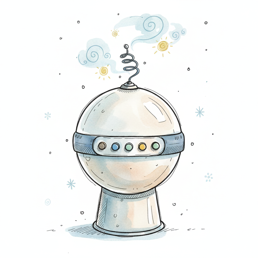 Cartoonhafte Wettermaschine mit Antenne, die Wolken und Sonnen erzeugt, im Aquarell-Stil.