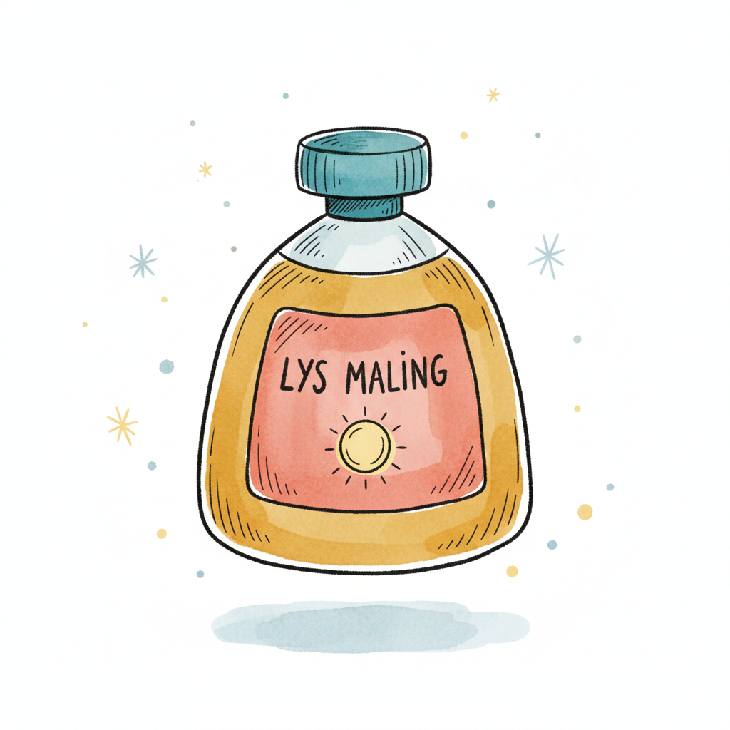 Aquarell-Illustration einer Flasche mit gelber Flüssigkeit, beschriftet mit 'LYS MALING' und Sonnensymbol.
