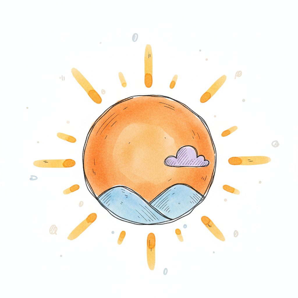 Aquarell-Illustration einer Sonne mit Bergen und Wolke im Inneren, umgeben von Sonnenstrahlen.