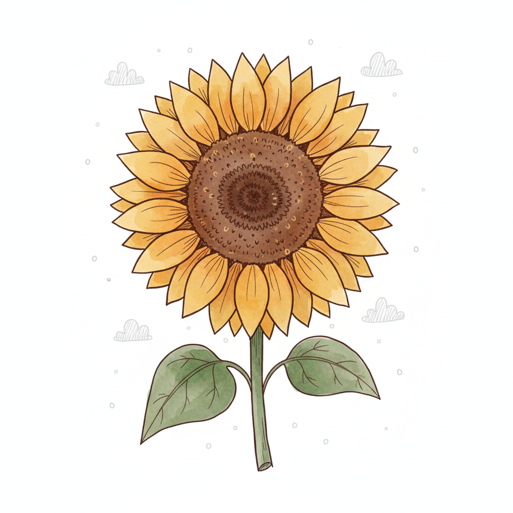 Eine farbenfrohe Aquarell-Sonnenblume mit gelben Blütenblättern und grünem Stiel auf weißem Grund.