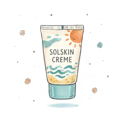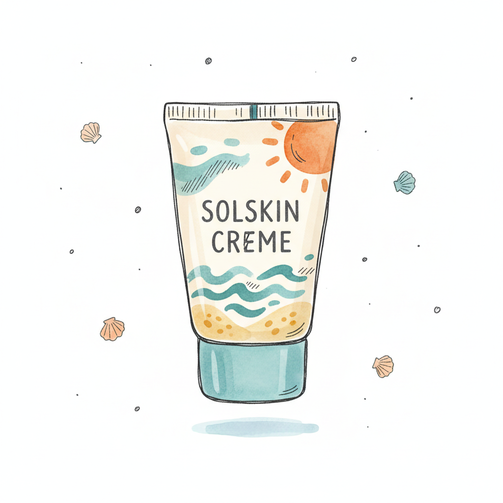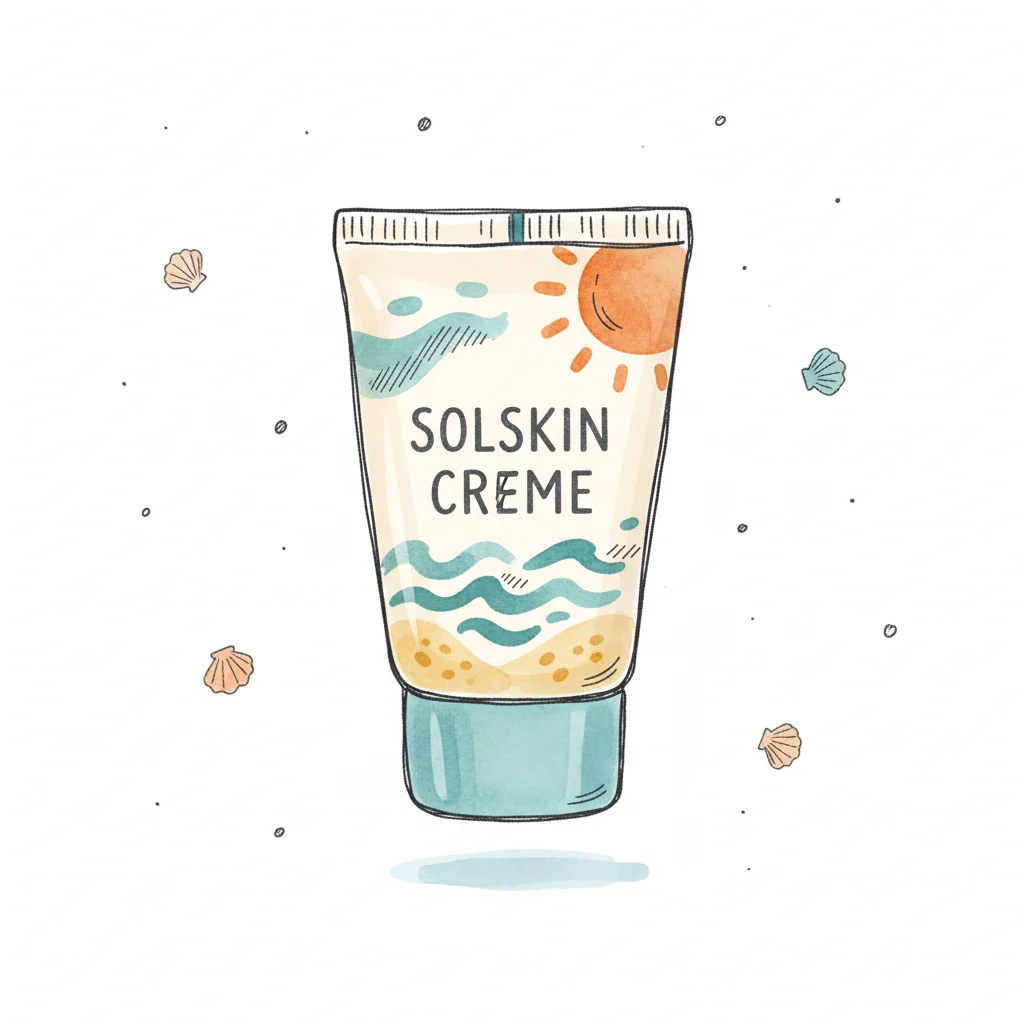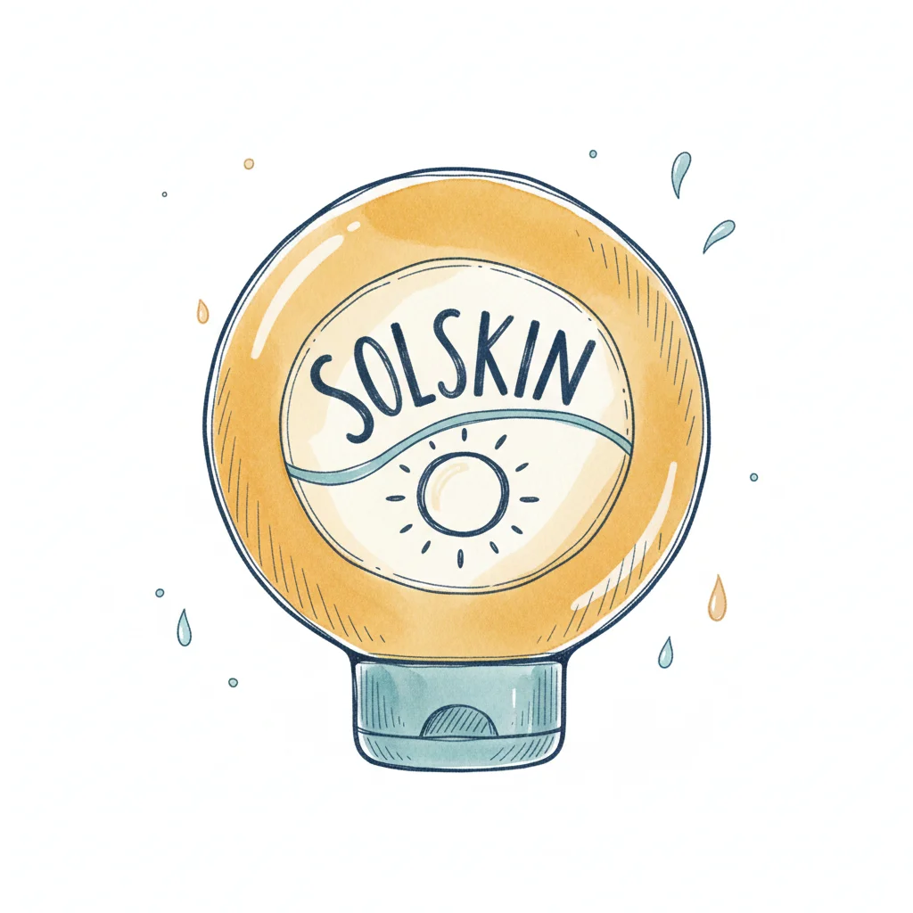 Handgezeichnete Illustration einer gelben Sonnencremeflasche mit "SOLSKIN" und Sonnensymbol auf dem Etikett.