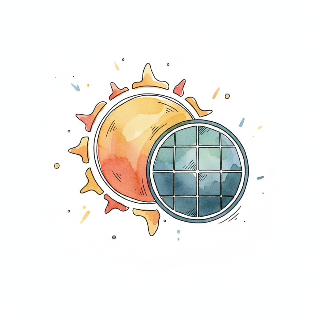 Aquarell-Illustration von Sonne und Solarpanel, symbolisiert Solarenergie und Nachhaltigkeit.