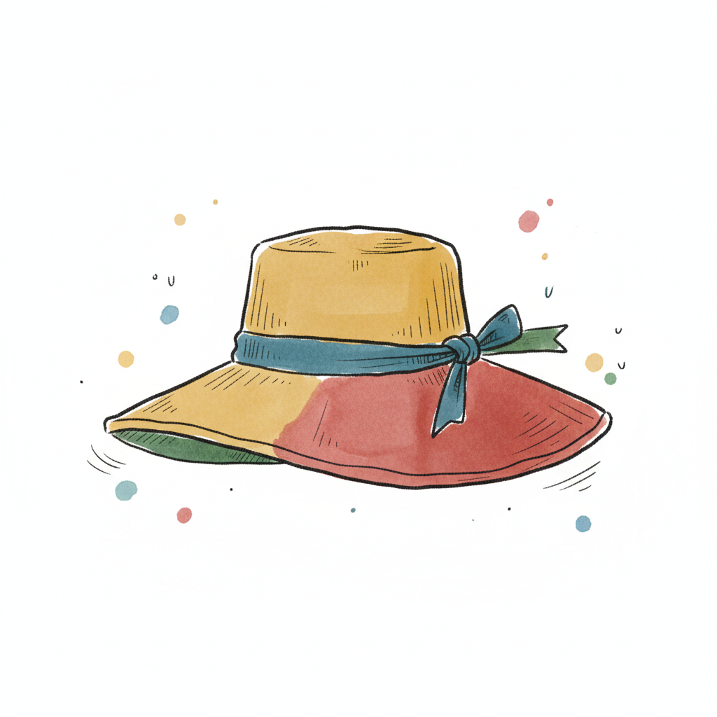 Aquarell-Illustration eines bunten Sommerhuts mit gelbem Kopf, rotem Rand und blauem Band.