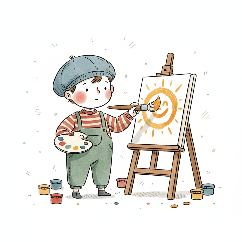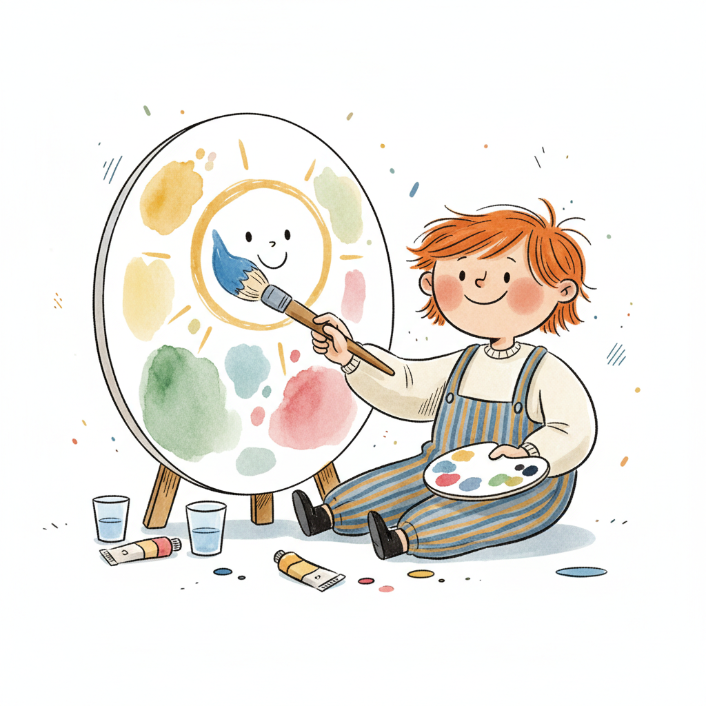 Ein Kind mit roten Haaren malt ein lächelndes Sonnenbild auf einer Staffelei.