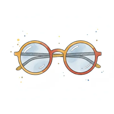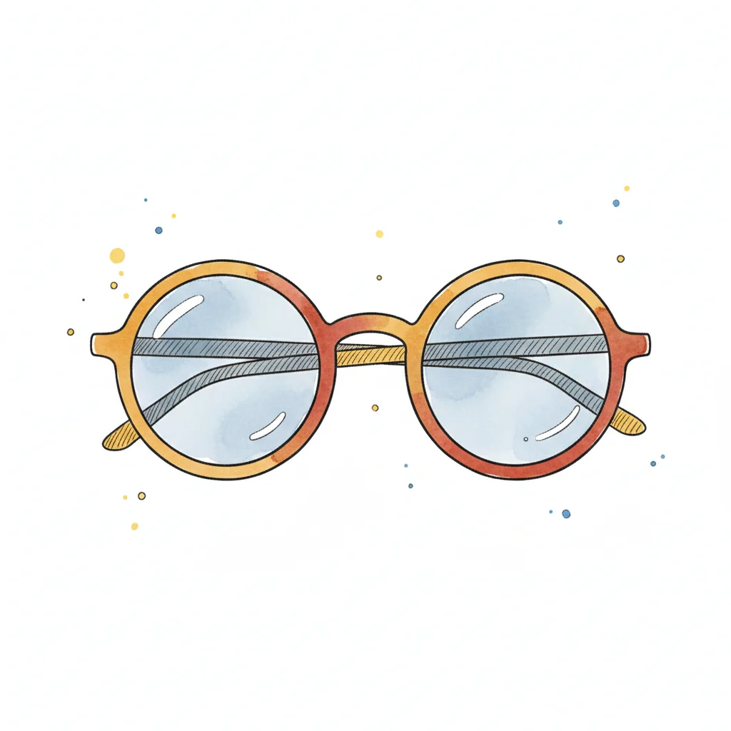 Aquarell-Illustration einer runden Brille mit orange-rotem Rahmen und bläulichen Gläsern.