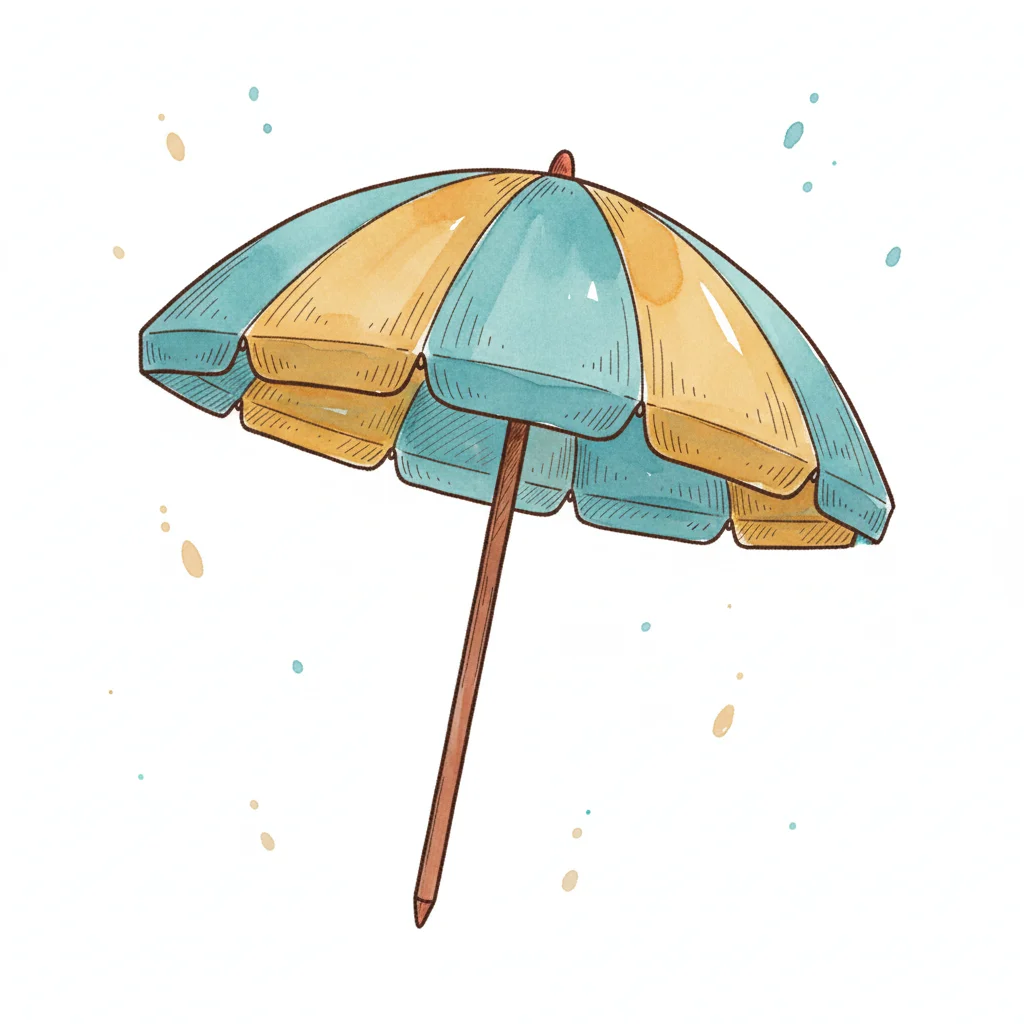 Aquarell-Illustration eines blau-gelb gestreiften Sonnenschirms, ideal für Strandmotive.