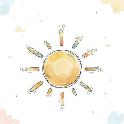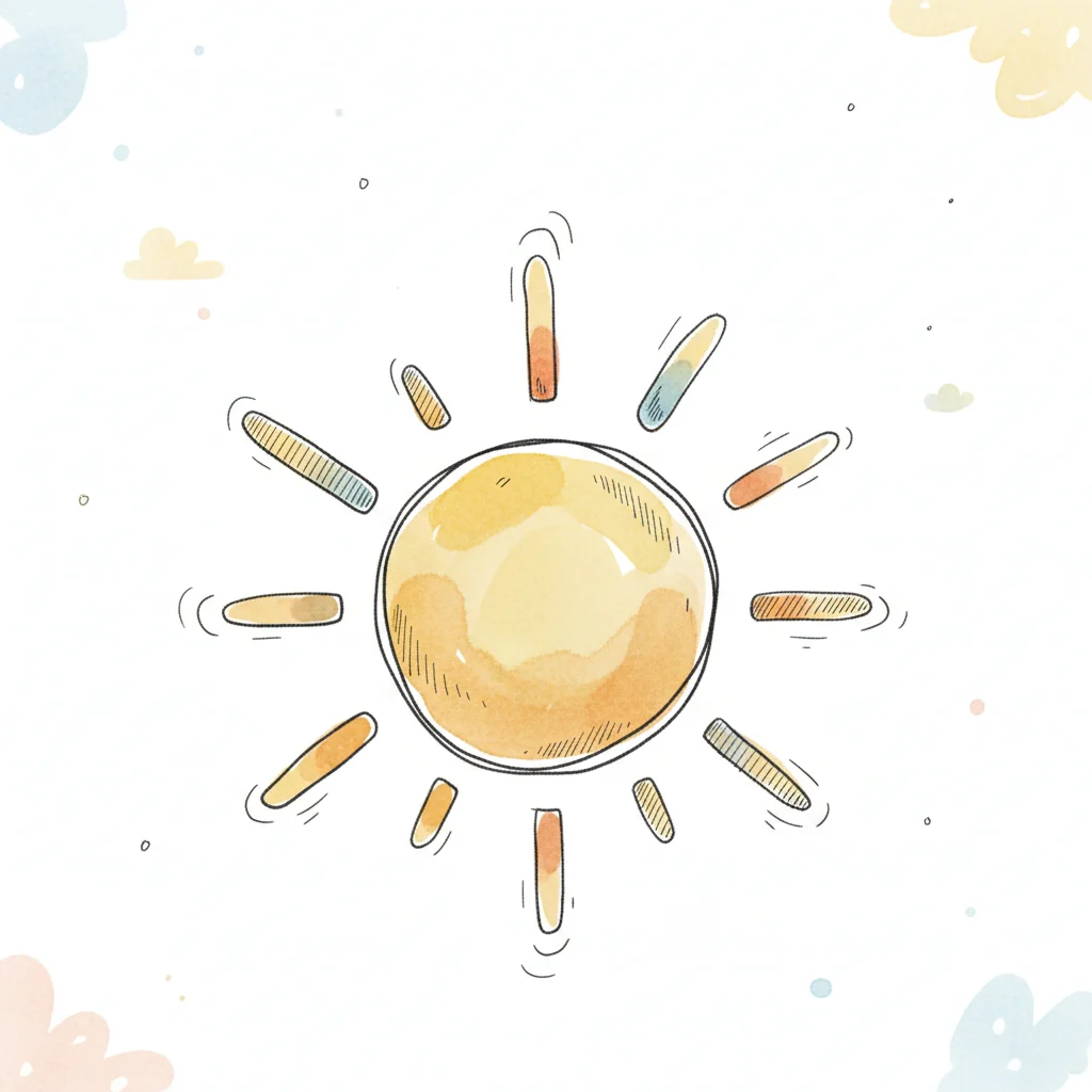 Fröhliche, handgezeichnete Sonne in Aquarellfarben mit bunten Strahlen auf hellem Hintergrund.