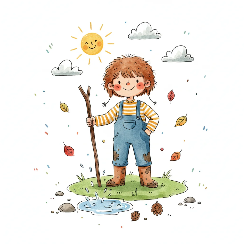 Lachendes Kind in Matschkleidung mit Stock spielt draußen bei Sonnenschein und Herbstlaub.