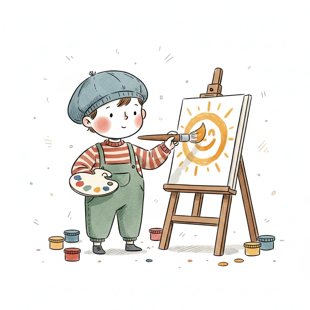 Ein kleines Kind malt ein fröhliches Sonnenbild auf einer Staffelei.