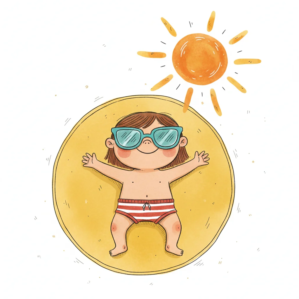 Fröhliches Kind mit Sonnenbrille entspannt auf einem gelben Handtuch unter der Sonne.