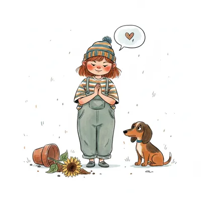 Süßes Mädchen entschuldigt sich bei Hund für umgefallene Sonnenblume, Herz-Sprechblase.