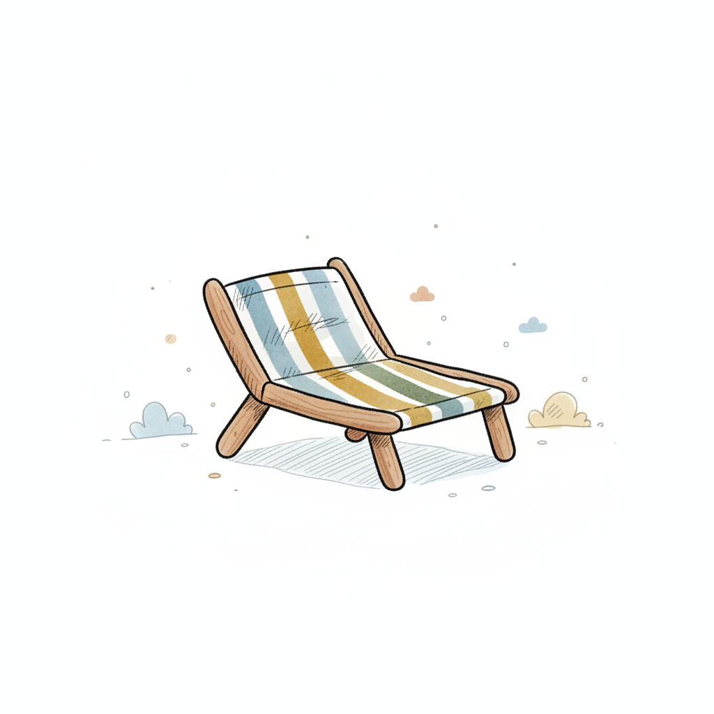 Cartoon-Stil Liegestuhl mit gestreiftem Stoff in Pastellfarben auf hellem Hintergrund.