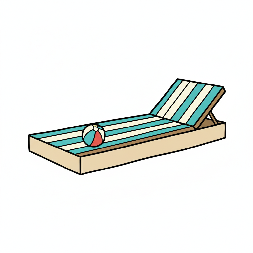 Illustrierte Strandliege mit blau-weißen Streifen und einem bunten Wasserball.