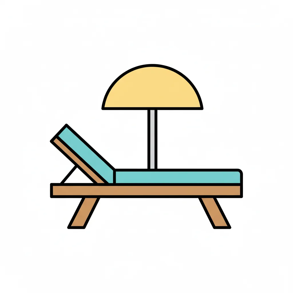 Illustration eines Liegestuhls mit blauem Polster und gelbem Sonnenschirm auf weißem Hintergrund.