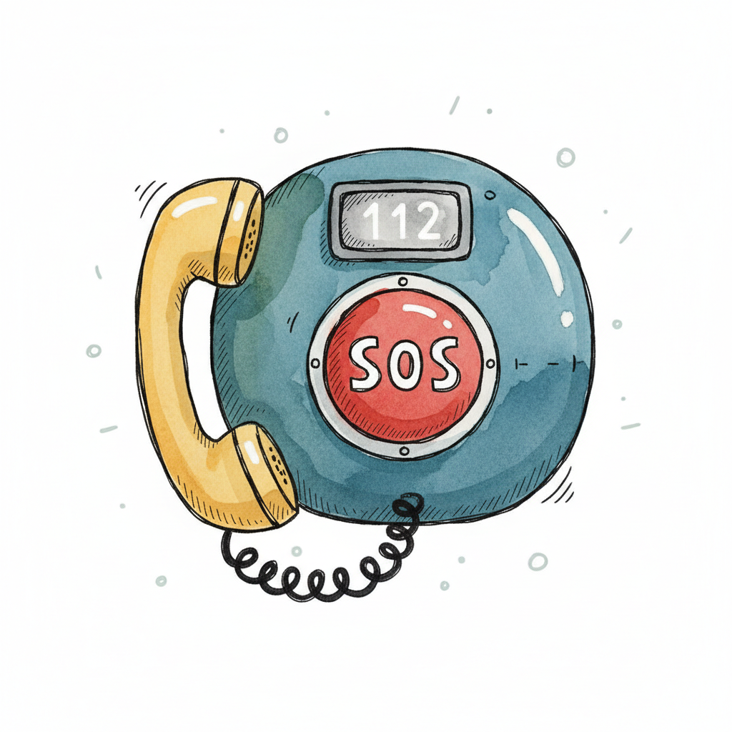 Aquarell-Illustration eines Notruftelefons mit SOS-Taste und der Nummer 112.