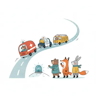 Tiere in Krankenwagen, Polizeiauto, Feuerwehr auf dem Weg zu Freunden mit SOS-Signal.