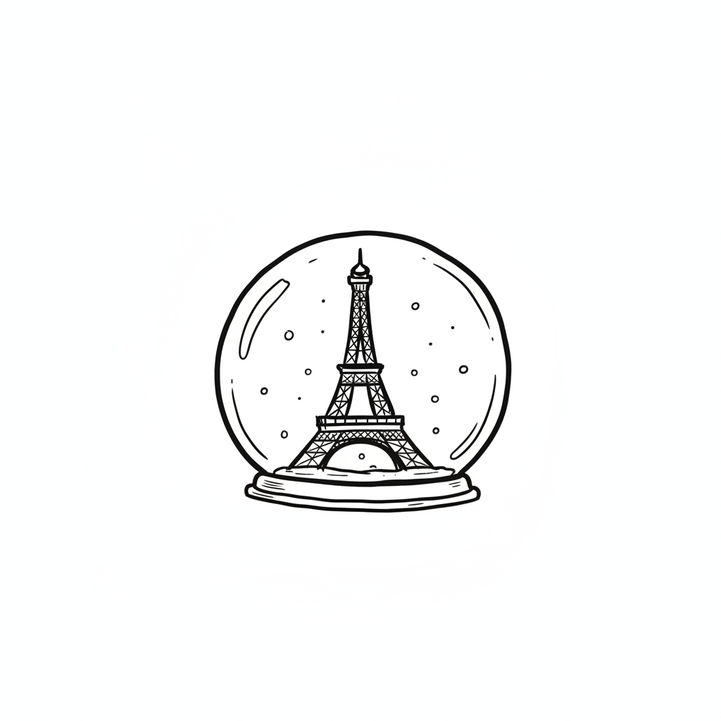 Schwarz-weiße Skizze des Eiffelturms in einer Schneekugel mit fallendem Schnee.