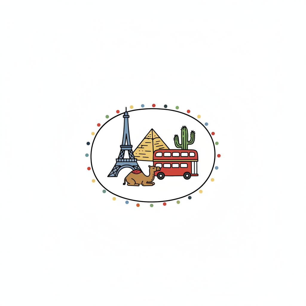 Bunte Illustration von Reisemotiven: Eiffelturm, Pyramide, Bus, Kamel, Kaktus in einem Oval.