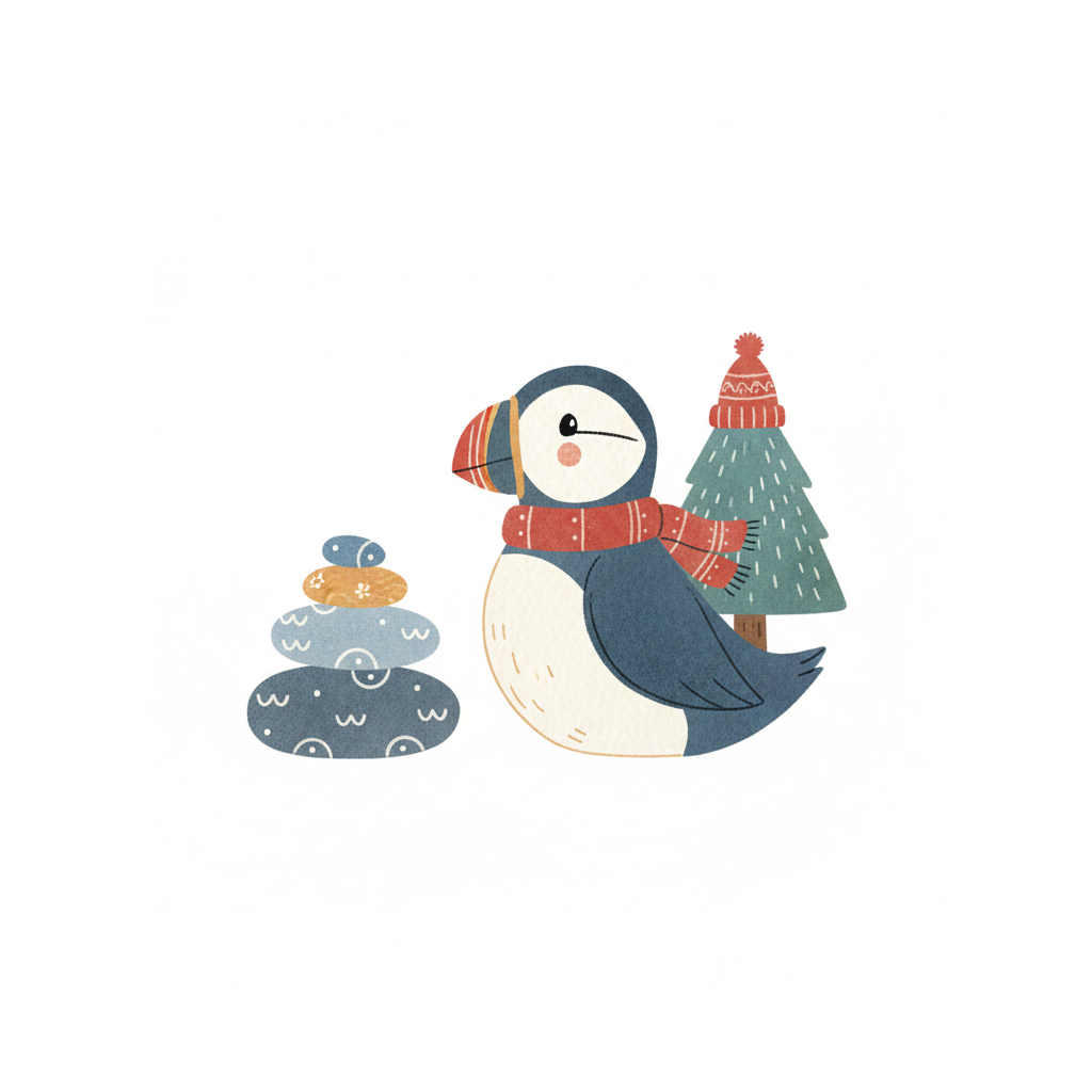 Niedlicher Papageientaucher mit Schal, Weihnachtsbaum und Steinstapel im Cartoon-Stil.