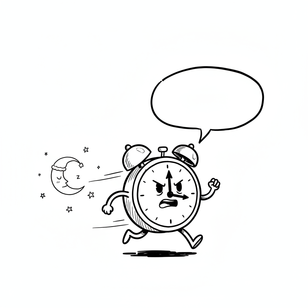 Wütender Wecker rennt vor dem schlafenden Mond weg, mit leerer Sprechblase.