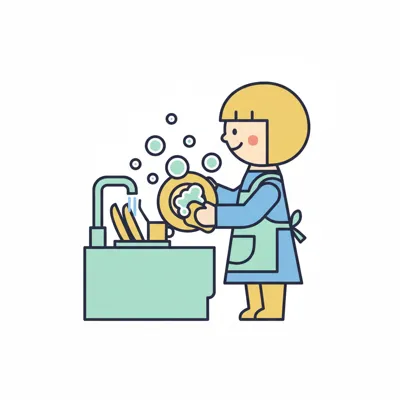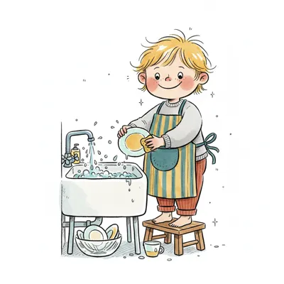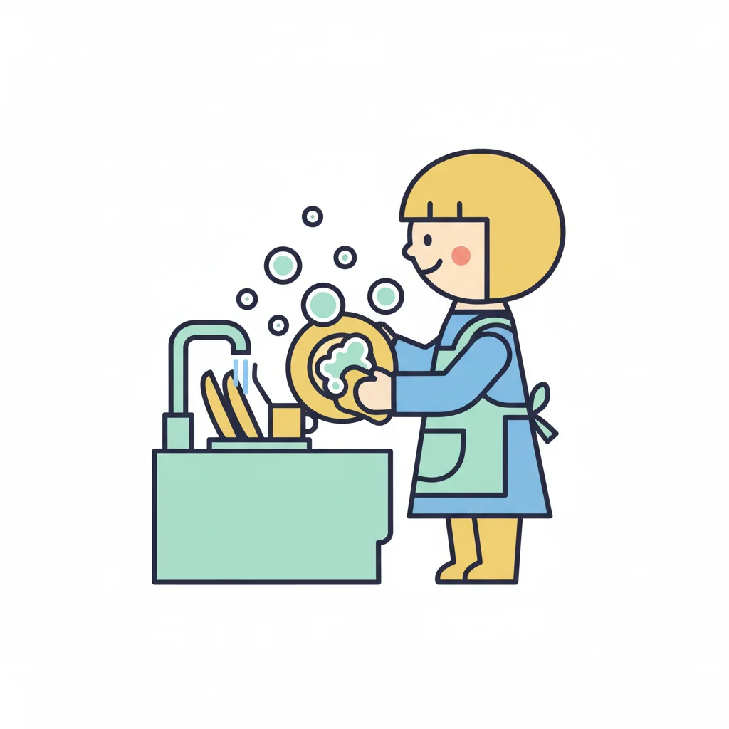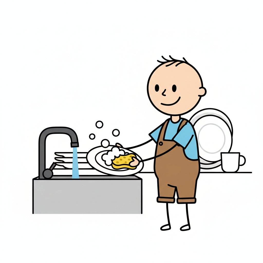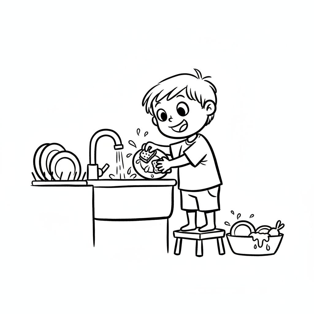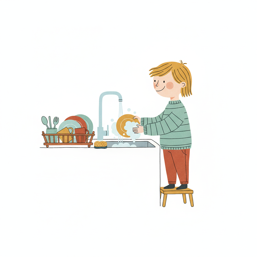 Ein lächelndes Cartoon-Kind spült Geschirr mit Schwamm und Seife am Spülbecken.
