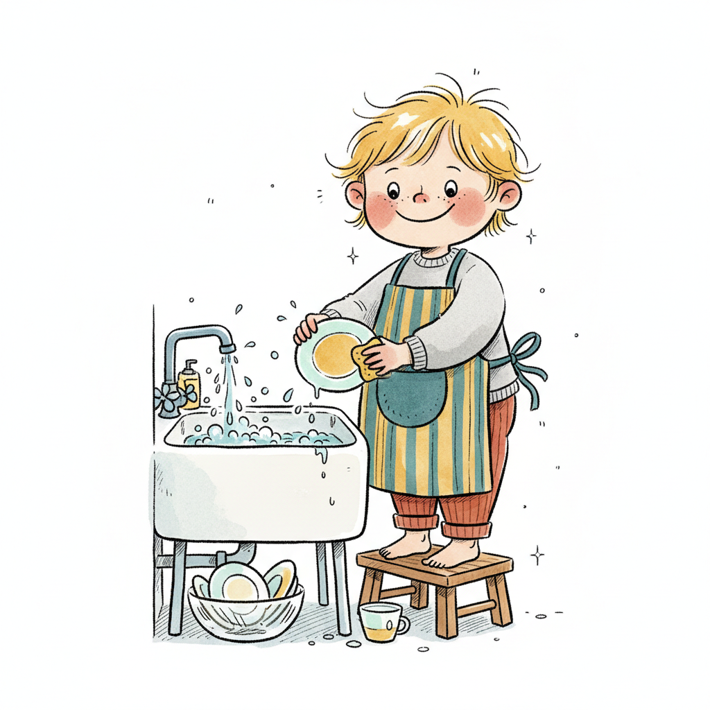Fröhliches Kind mit Schürze wäscht Geschirr am Spülbecken, steht auf einem Hocker.