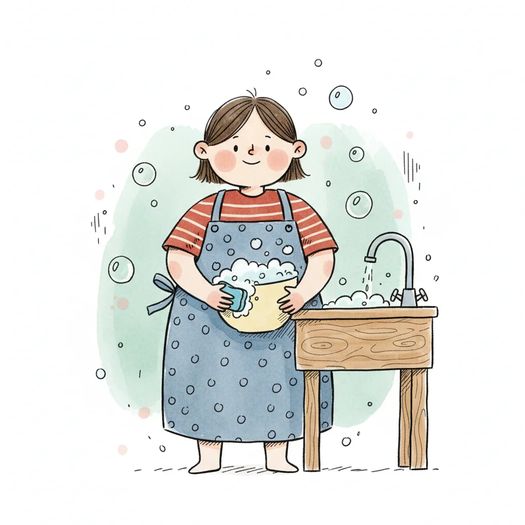 Fröhliche Cartoon-Figur wäscht Geschirr mit Seifenblasen an einem Spülbecken.