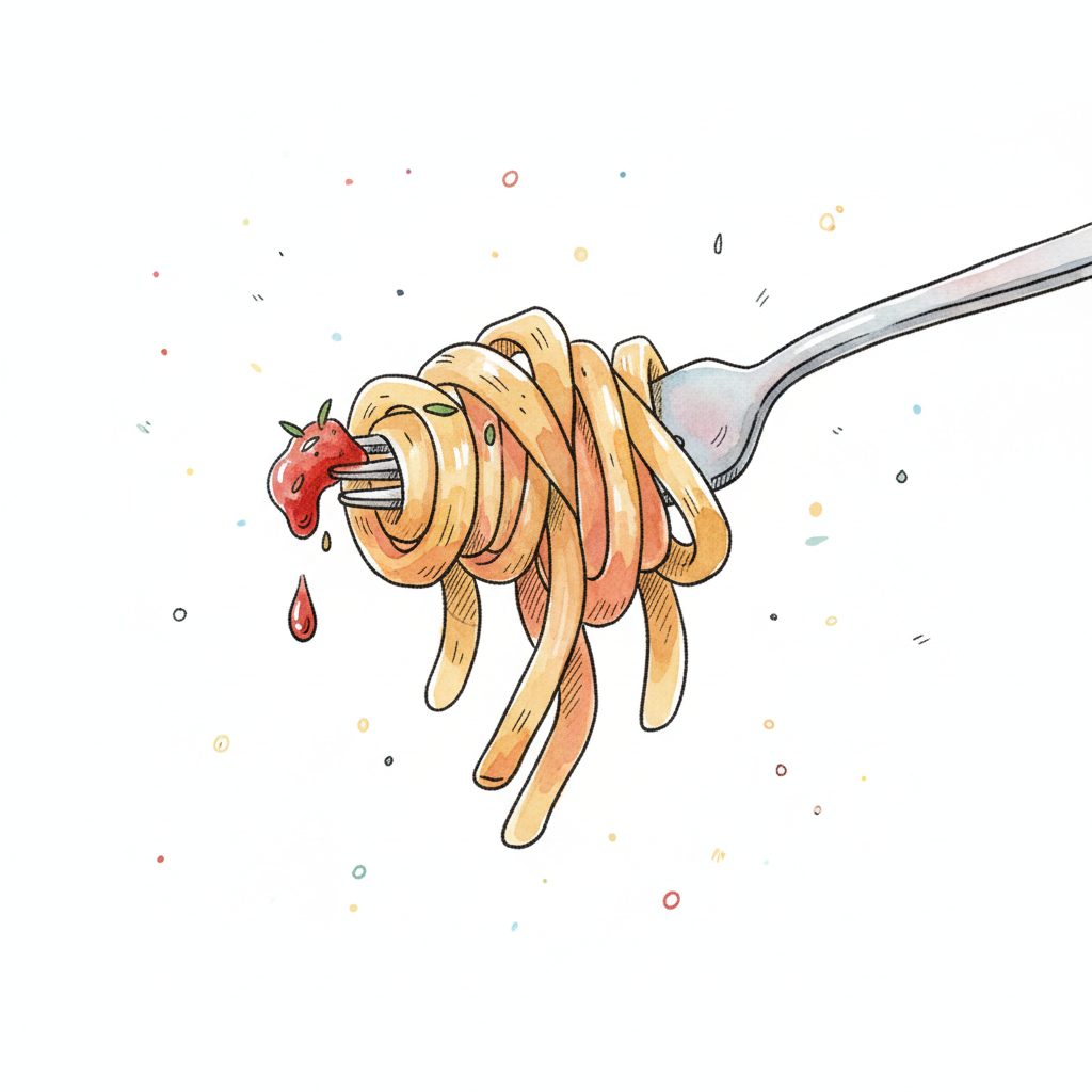 Ein kunstvolles Bild von Spaghetti auf einer Gabel mit Tomatensoße.