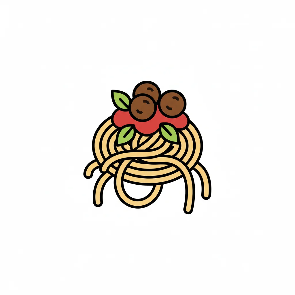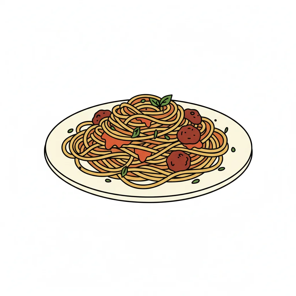 Ein Teller Spaghetti mit Fleischbällchen und grünen Blättern.