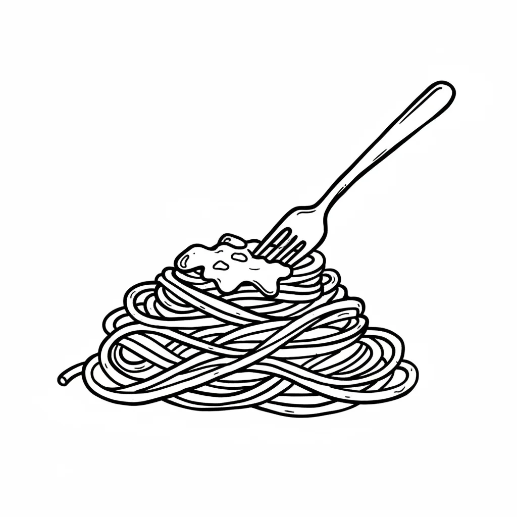 Eine Gabel steckt in einem Haufen Spaghetti mit Sauce.