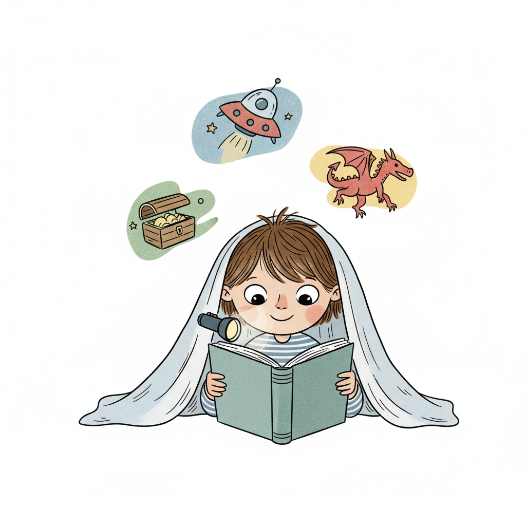 Ein Kind liest unter einer Decke mit Taschenlampe und stellt sich fantastische Abenteuer vor.