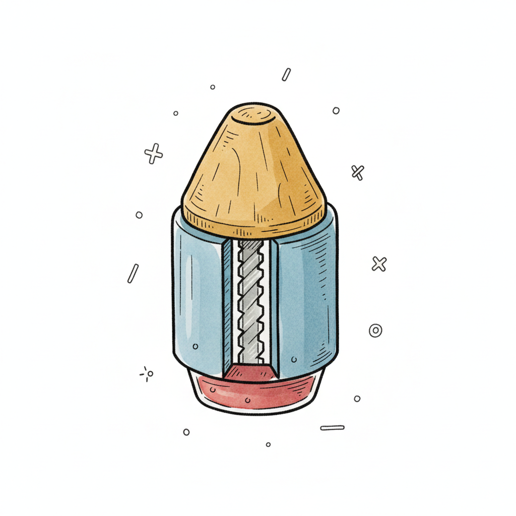 Bunter Bleistiftspitzer im Cartoon-Stil mit Holzaufsatz und transparentem Auffangbehälter.