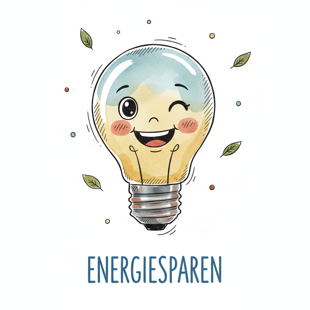 Fröhliche, zwinkernde Glühbirne im Aquarellstil mit Blättern und 'ENERGIESPAREN' Schriftzug.