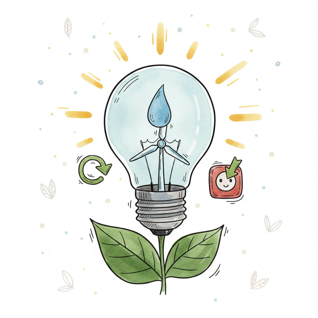 Nachhaltige Energie: Glühbirne mit Windrad, Wassertropfen, Blättern, Recycling und Steckdose.