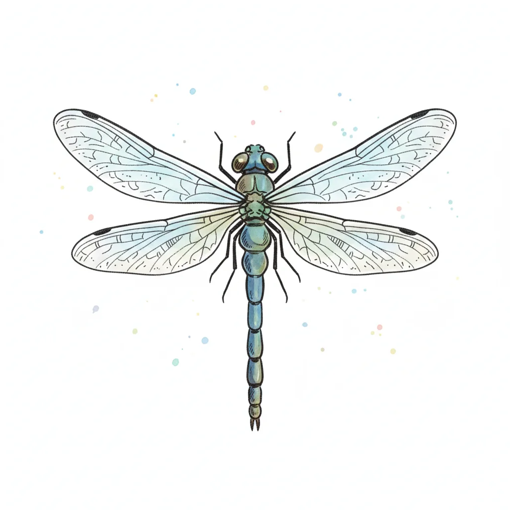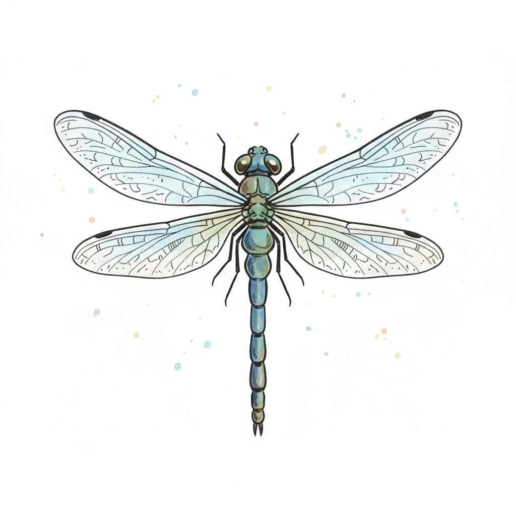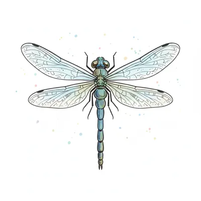 Detailreiche Illustration einer blauen Libelle mit transparenten Flügeln auf weißem Hintergrund.