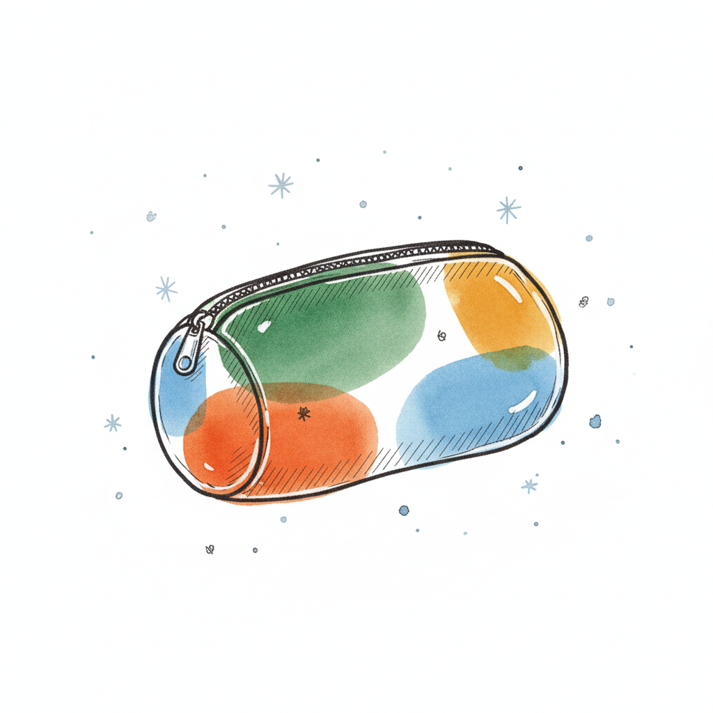Transparente Federtasche mit bunten, aquarellartigen Formen und Reißverschluss.