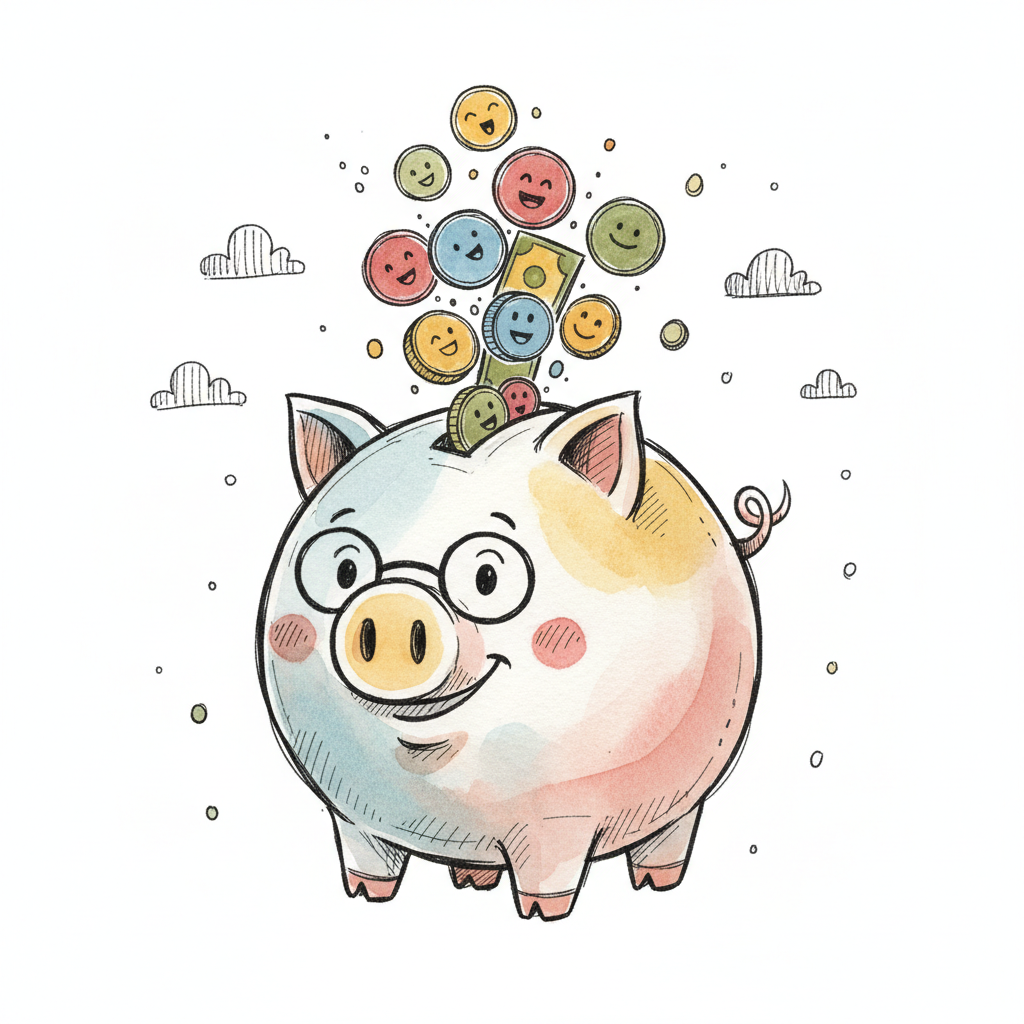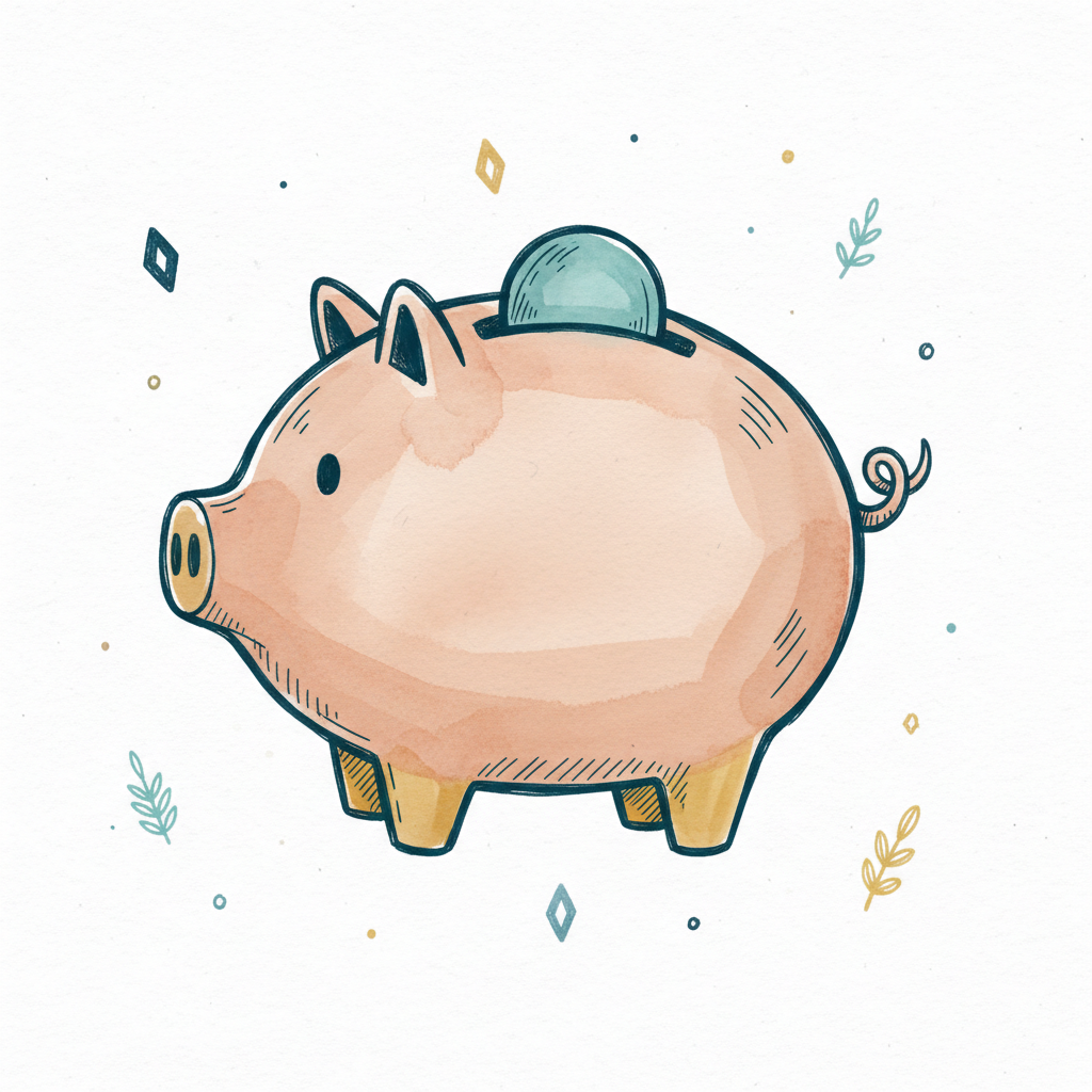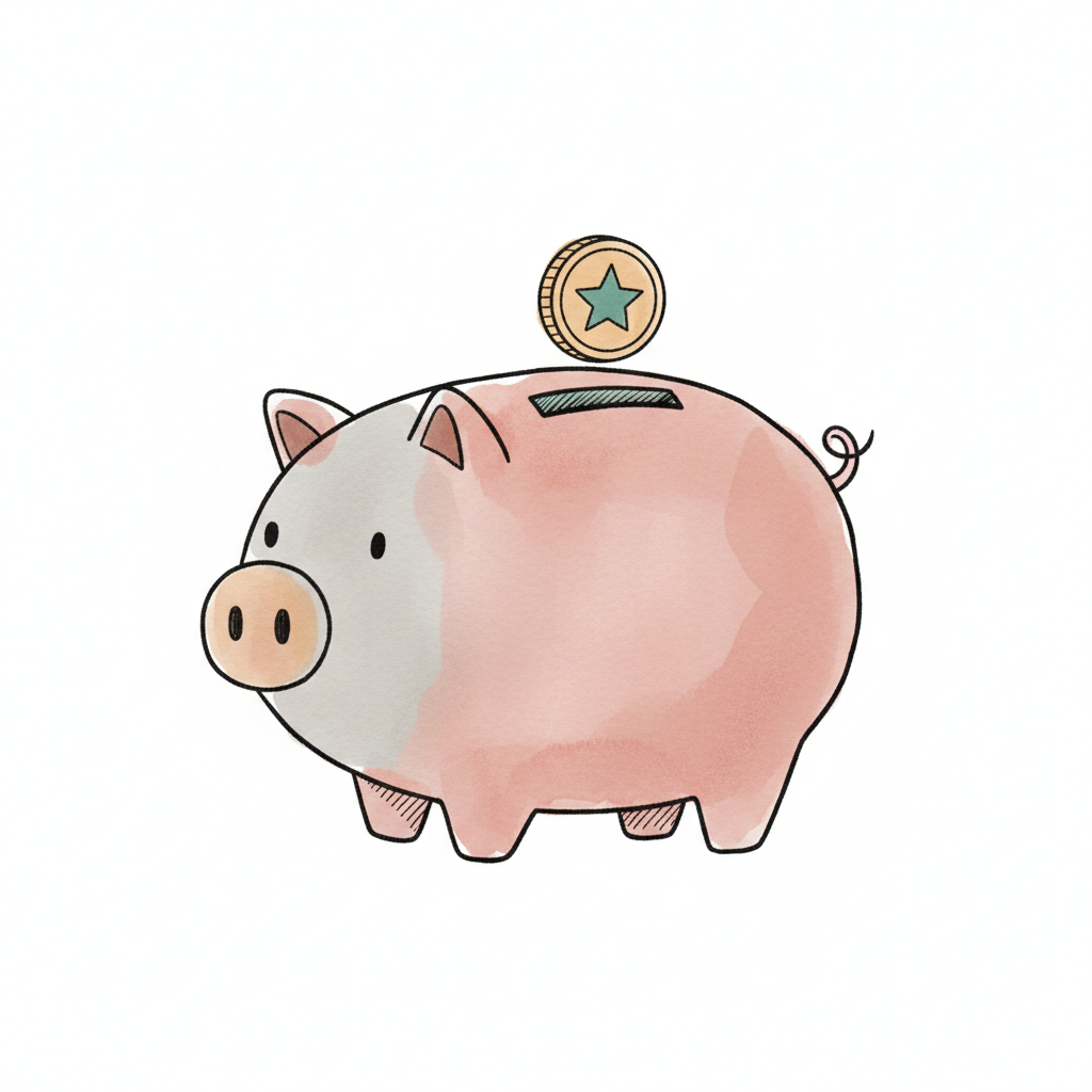 Aquarell-Illustration eines rosa Sparschweins, in das eine Münze mit Stern fällt.