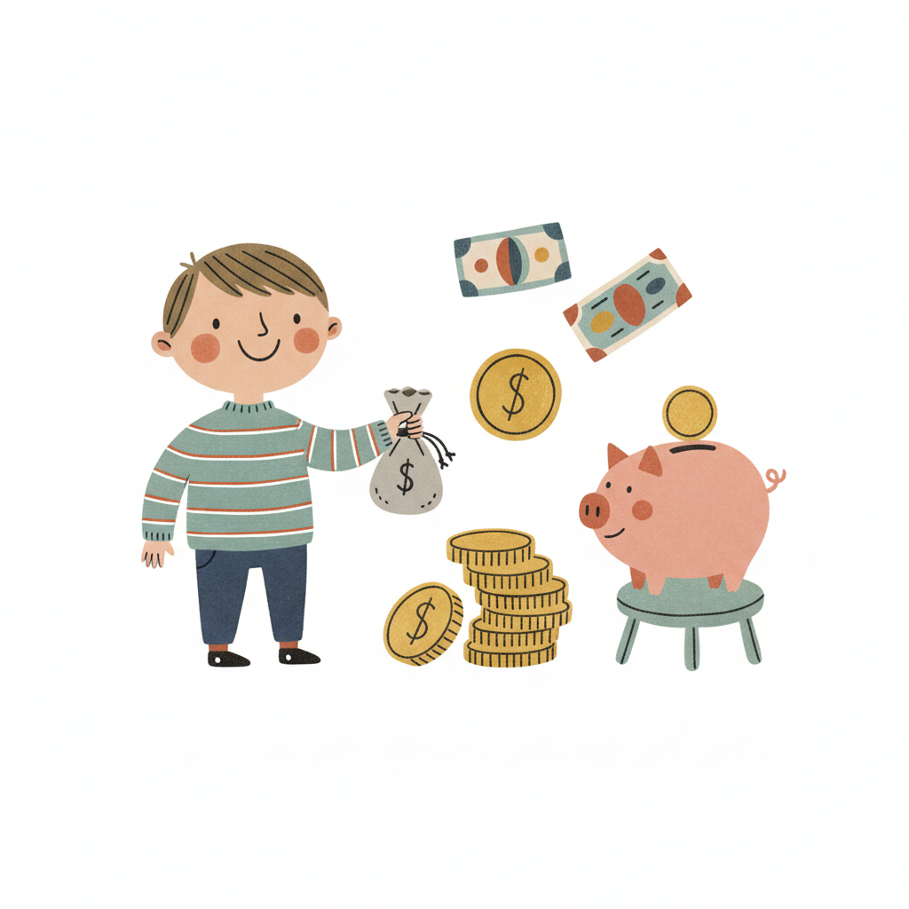 Ein Cartoon-Junge mit Geldsack, Münzen, Scheinen und Sparschwein, symbolisiert Sparen.