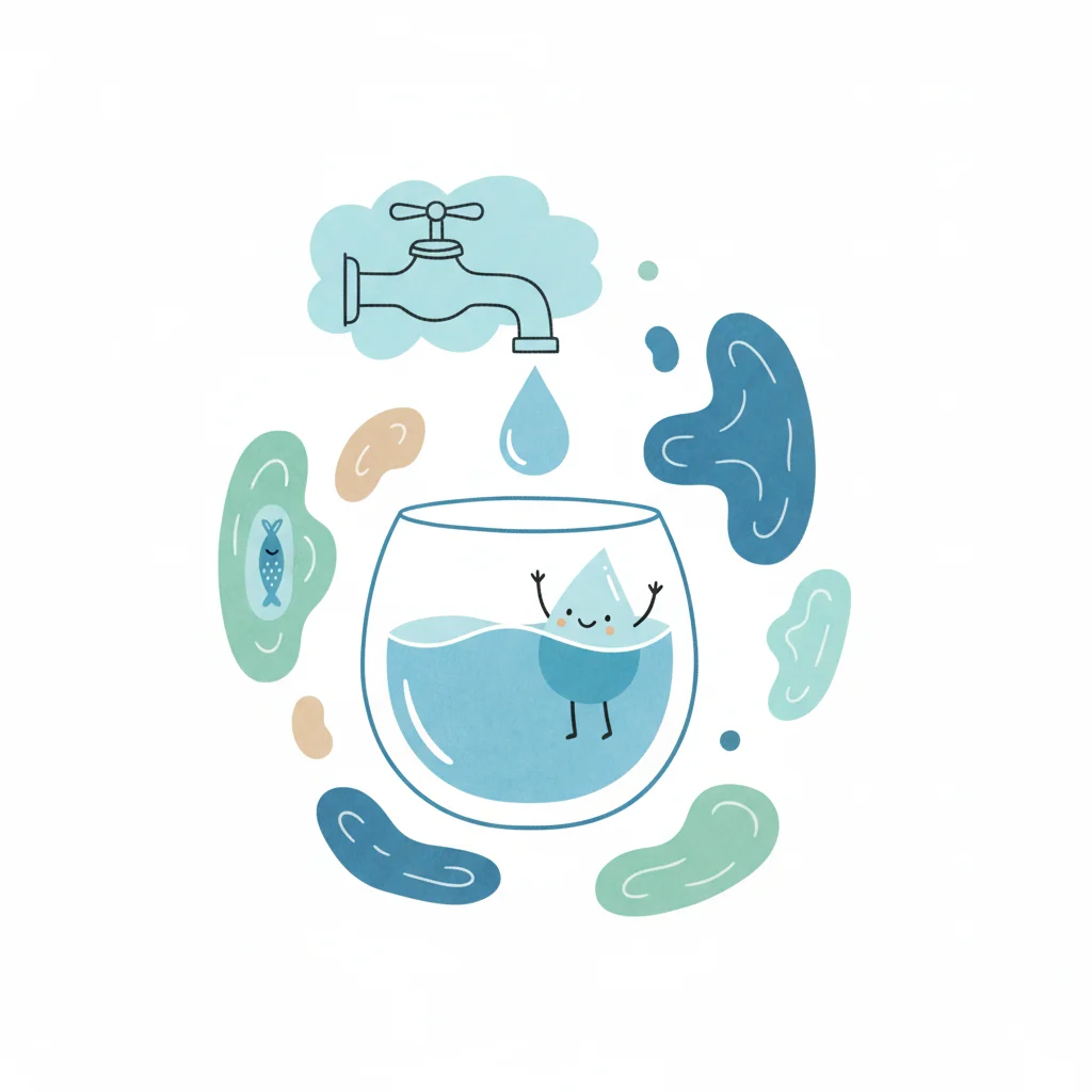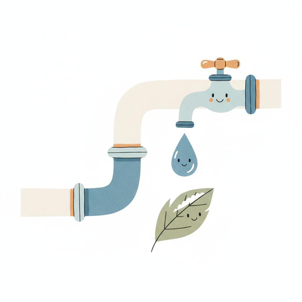Cartoon-Wasserhahn mit lächelndem Wassertropfen und Blatt, symbolisiert Wassersparen und Natur.