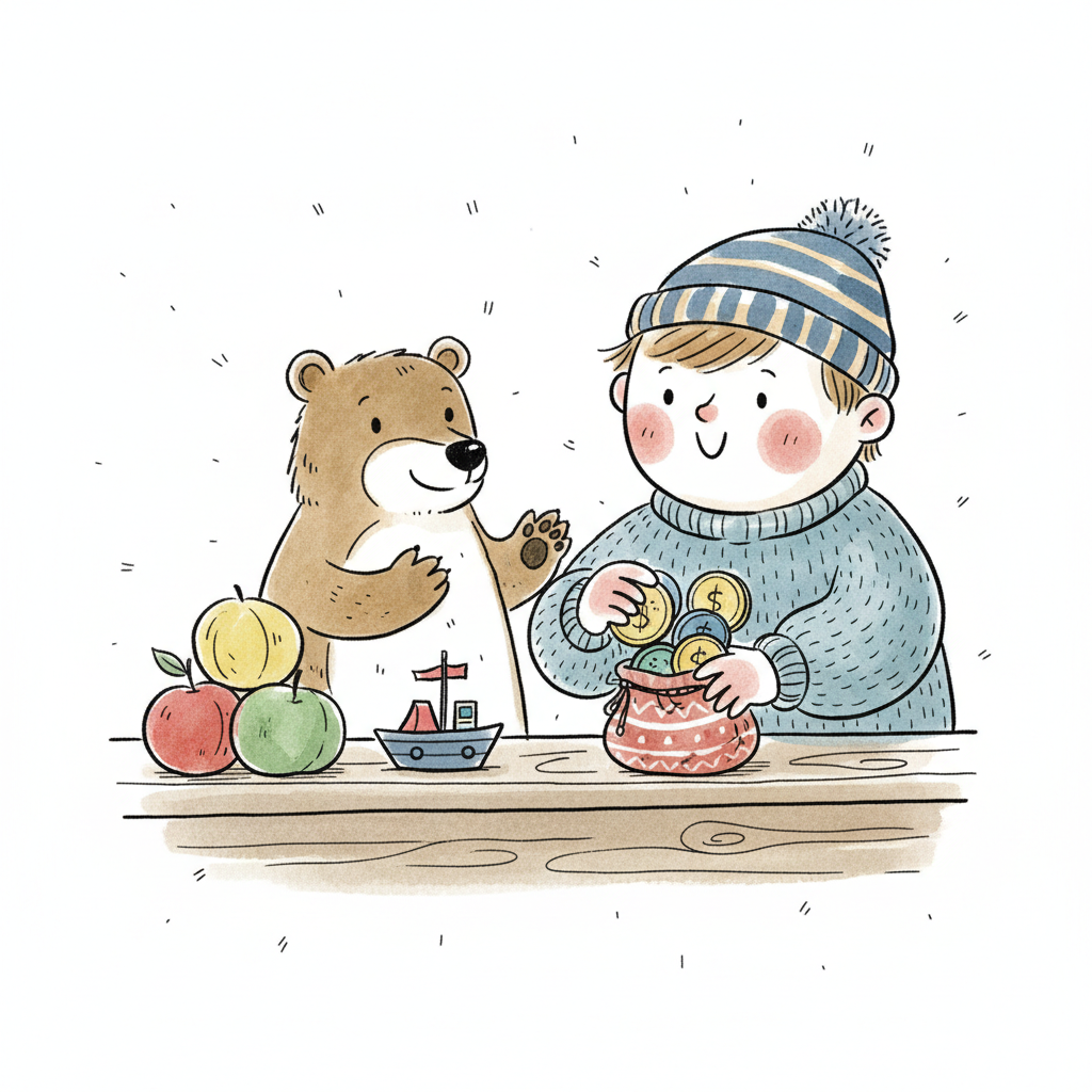 Süße Illustration: Junge und Bär zählen Münzen in einen Beutel, daneben Äpfel und ein Spielzeugboot.