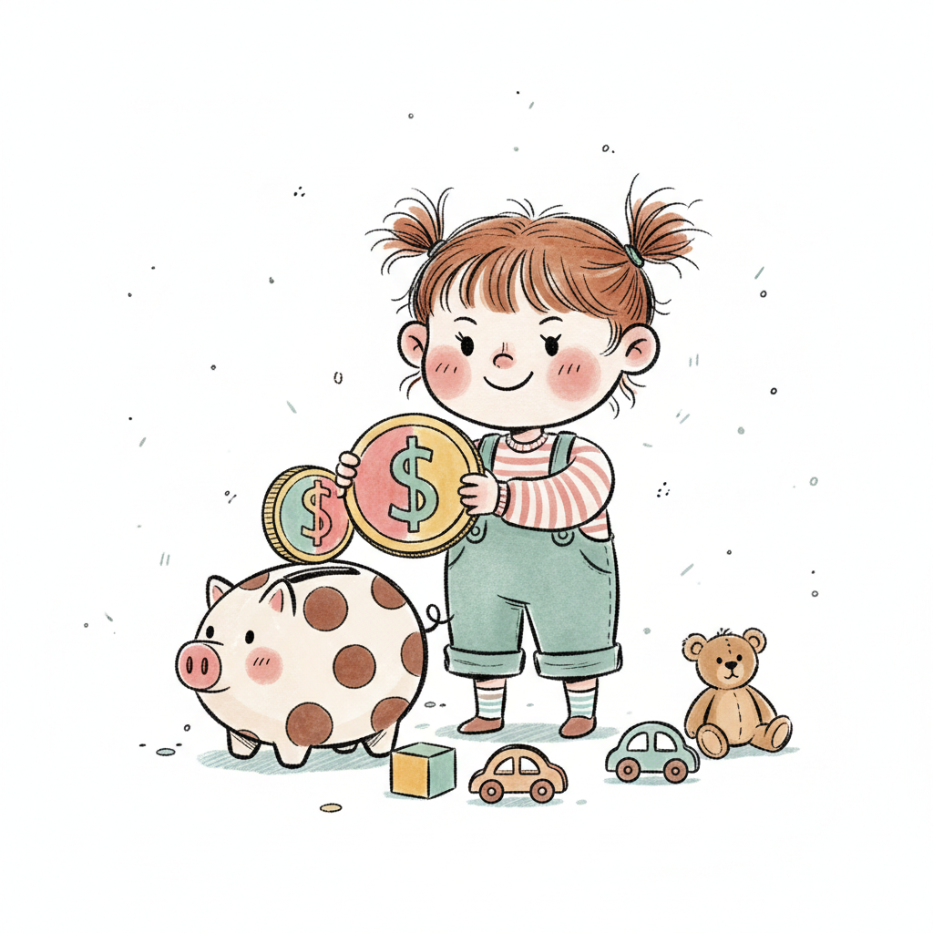 Fröhliches Mädchen mit Schürze steckt Münze in Sparschwein, während Geld um sie schwebt.