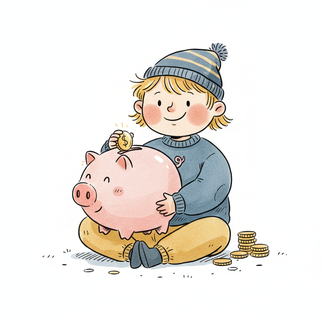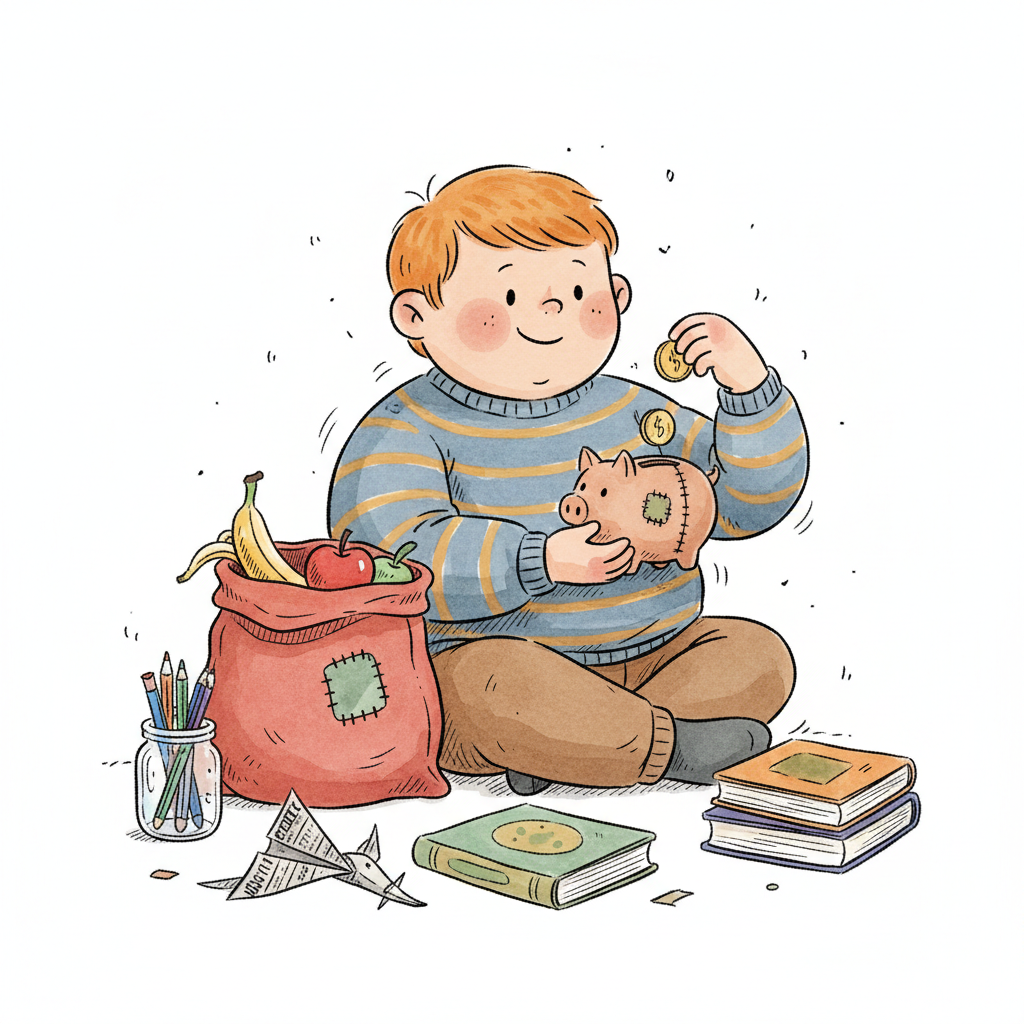 Ein Junge steckt Münzen in ein Sparschwein, umgeben von Büchern, Obst und Stiften.