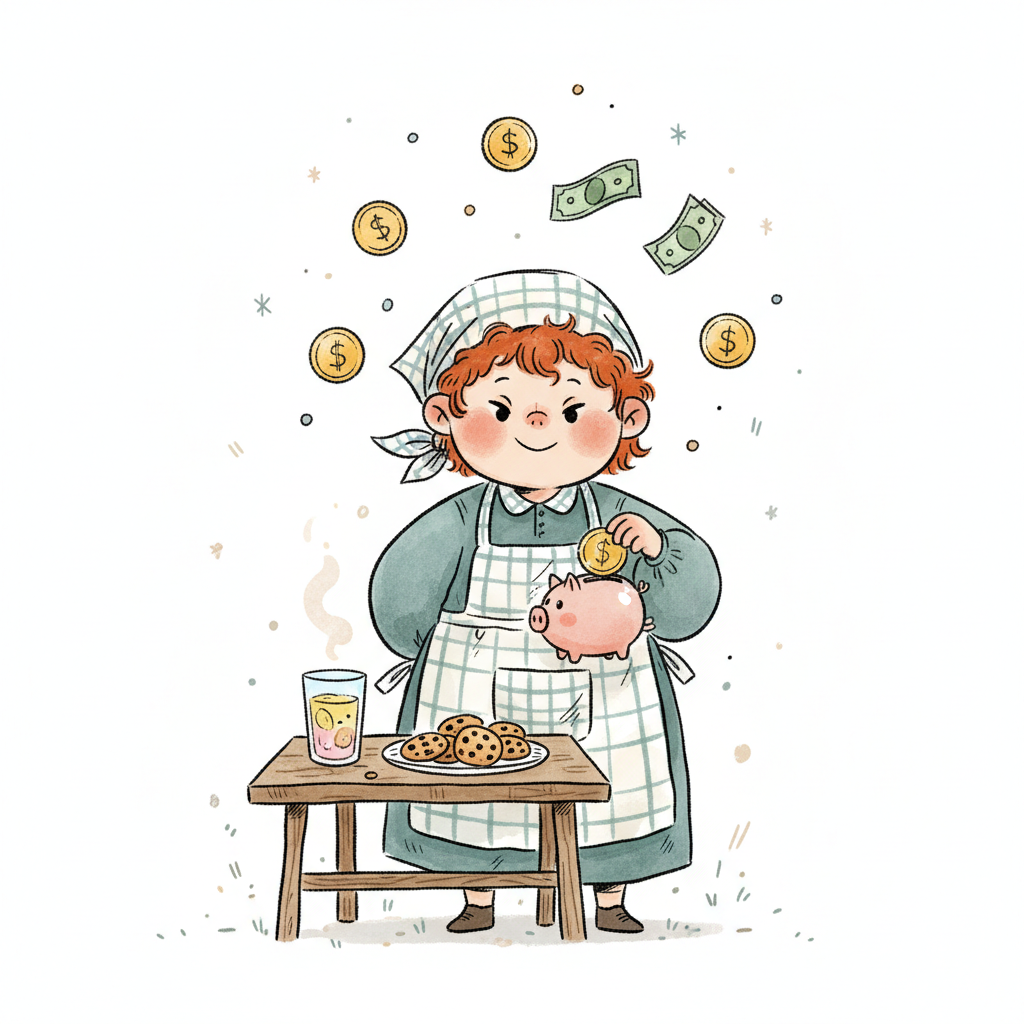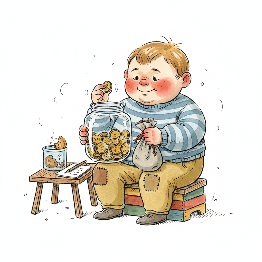 Ein kleiner Junge zählt Münzen in einem Glas, daneben Kekse und ein Geldsack.
