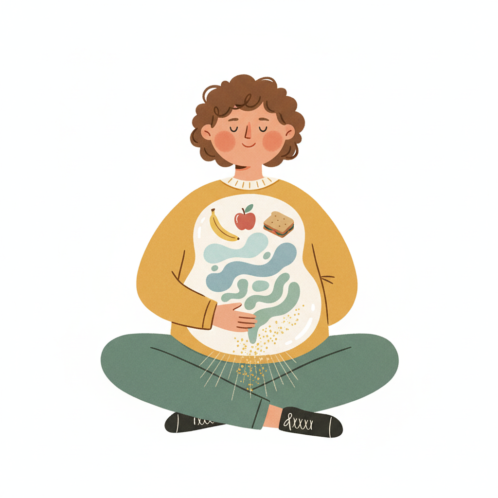 Glückliche Person mit transparentem Bauch, der Verdauung von gesunder Nahrung darstellt.