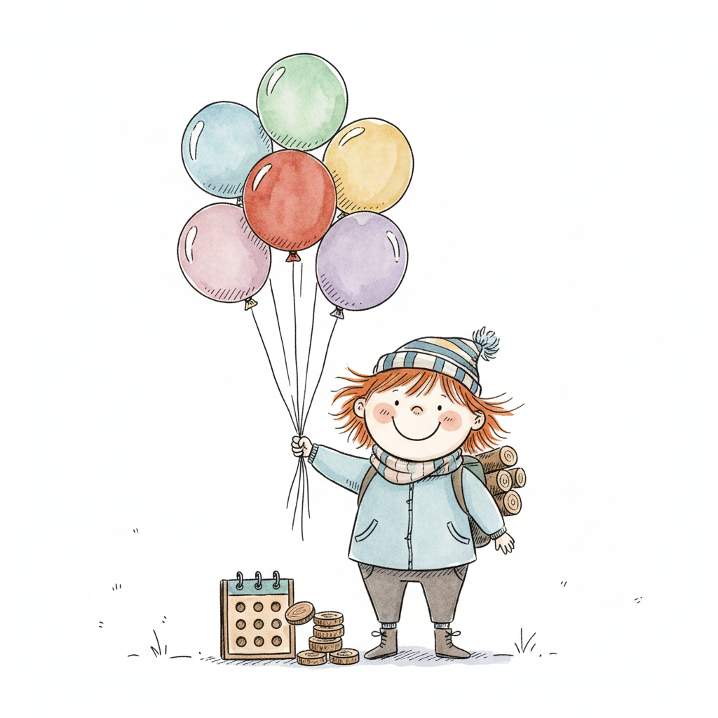 Fröhliches Kind mit bunten Ballons, Rucksack, Kalender und Münzen, Aquarell-Illustration.