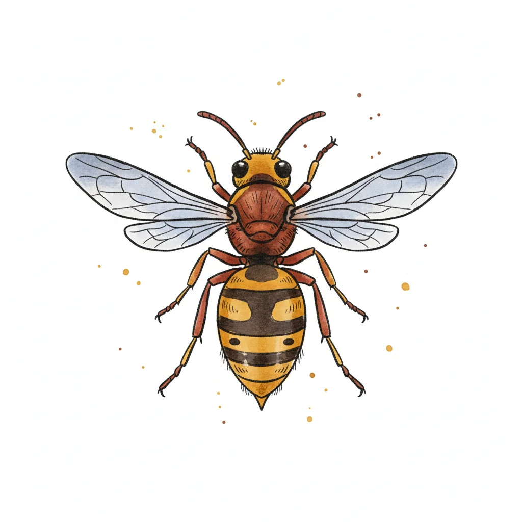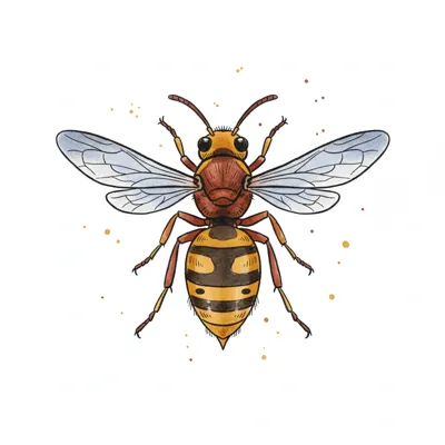 Detailreiche Illustration einer Wespe mit gelb-schwarzem Körper und transparenten Flügeln auf weißem Grund.