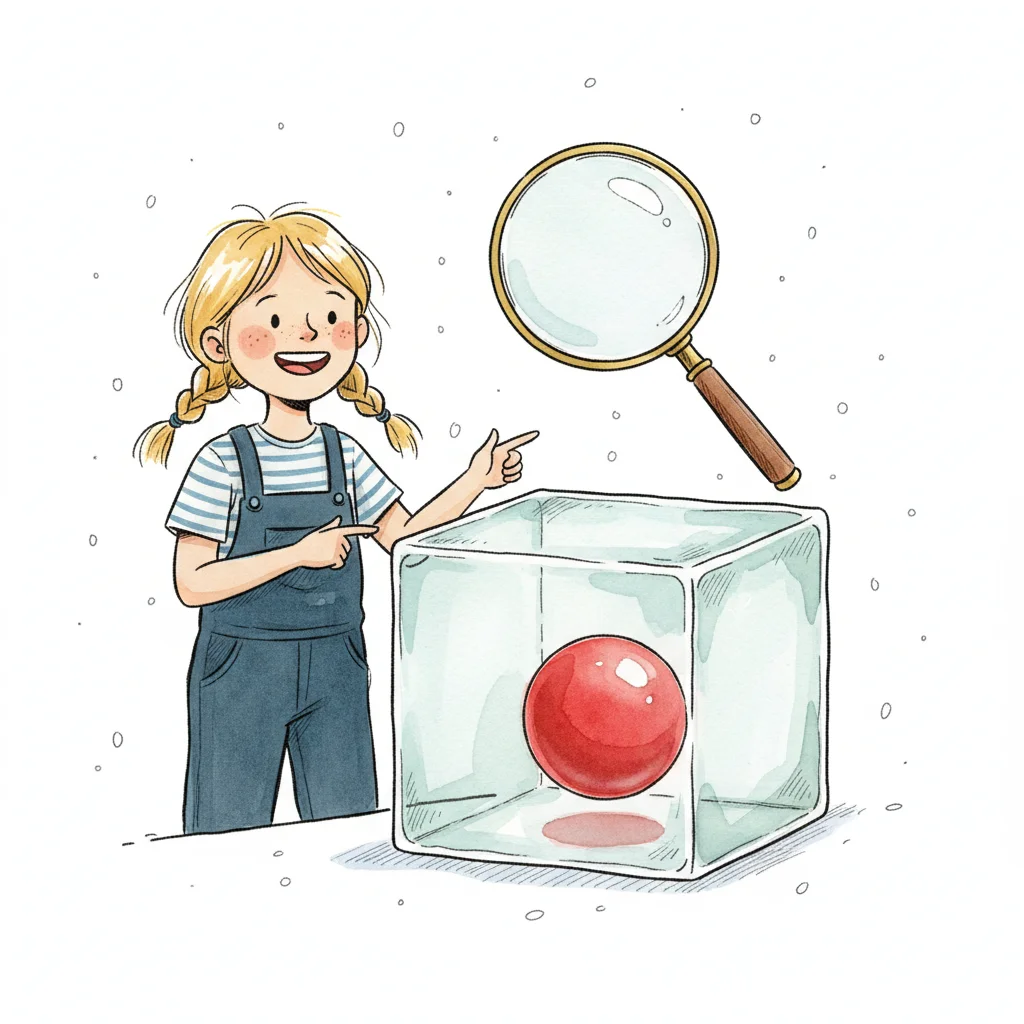 Mädchen zeigt auf schwebende rote Kugel in einem transparenten Würfel, Lupe schwebt darüber.